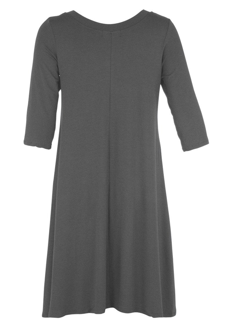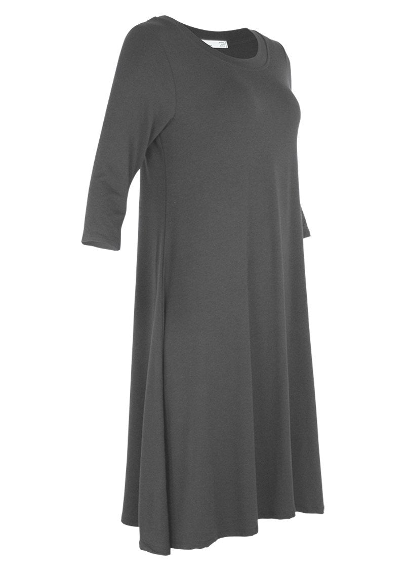 This dark grey half sleeve jersey dress provides a fabulous and elegant fit. A flattering scoop neckline followed by a straight bodice and finished with an aline skirt. Add a belt, some wedges and a statement necklace to go to town, layer it with boots, scarves and and waistcoat for cooler days or wear it with flats and a long string of beads for a casual approach.