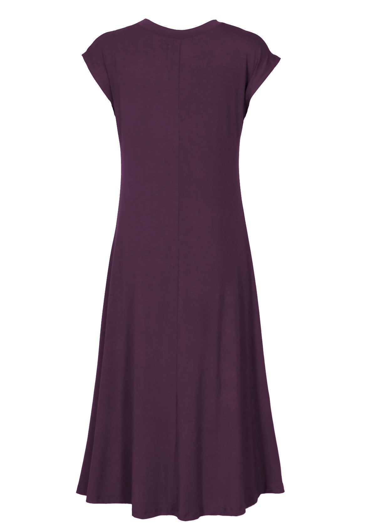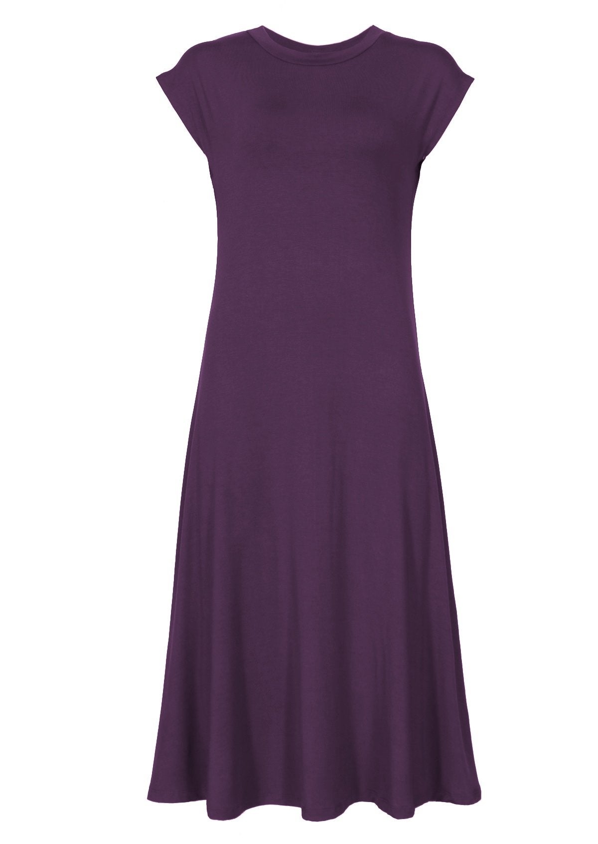 These purple stretch rayon dresses are incredibly comfortable and have a slight A-line shape that gracefully falls to mid calf. Features a high round neckline to protect the décolletage, and cap sleeves. An ideal addition to any woman’s wardrobe, with its ability to be dressed up or dressed down. Pair with low boots, sandal or even a pair of heels for going out!