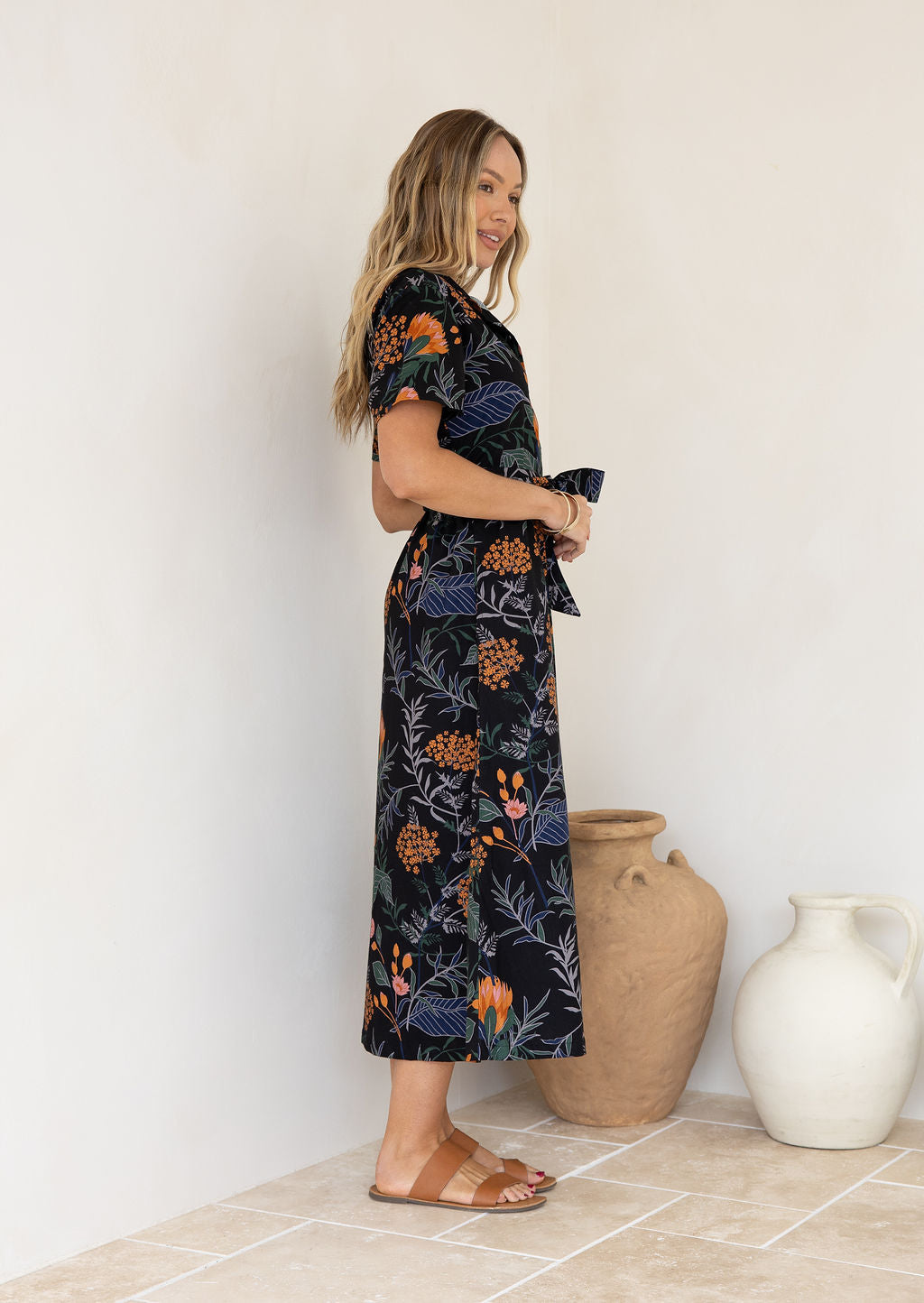 Meet the Chelsea Dress, a chic button-through shirt dress inspired by 1950s style. Now available in the elegant Queen Protea print, featuring a moody botanical design in dark blue, green, and grey, with contrasting orange and pink accents on a black base. This dress offers a flattering collar, classic shirt sleeves, a removable wide waist tie, and hidden side pockets. Pair it with sandals for a relaxed look or dress it up with heels and statement jewelry. Try swapping out the waist tie for a belt for a cinched look.