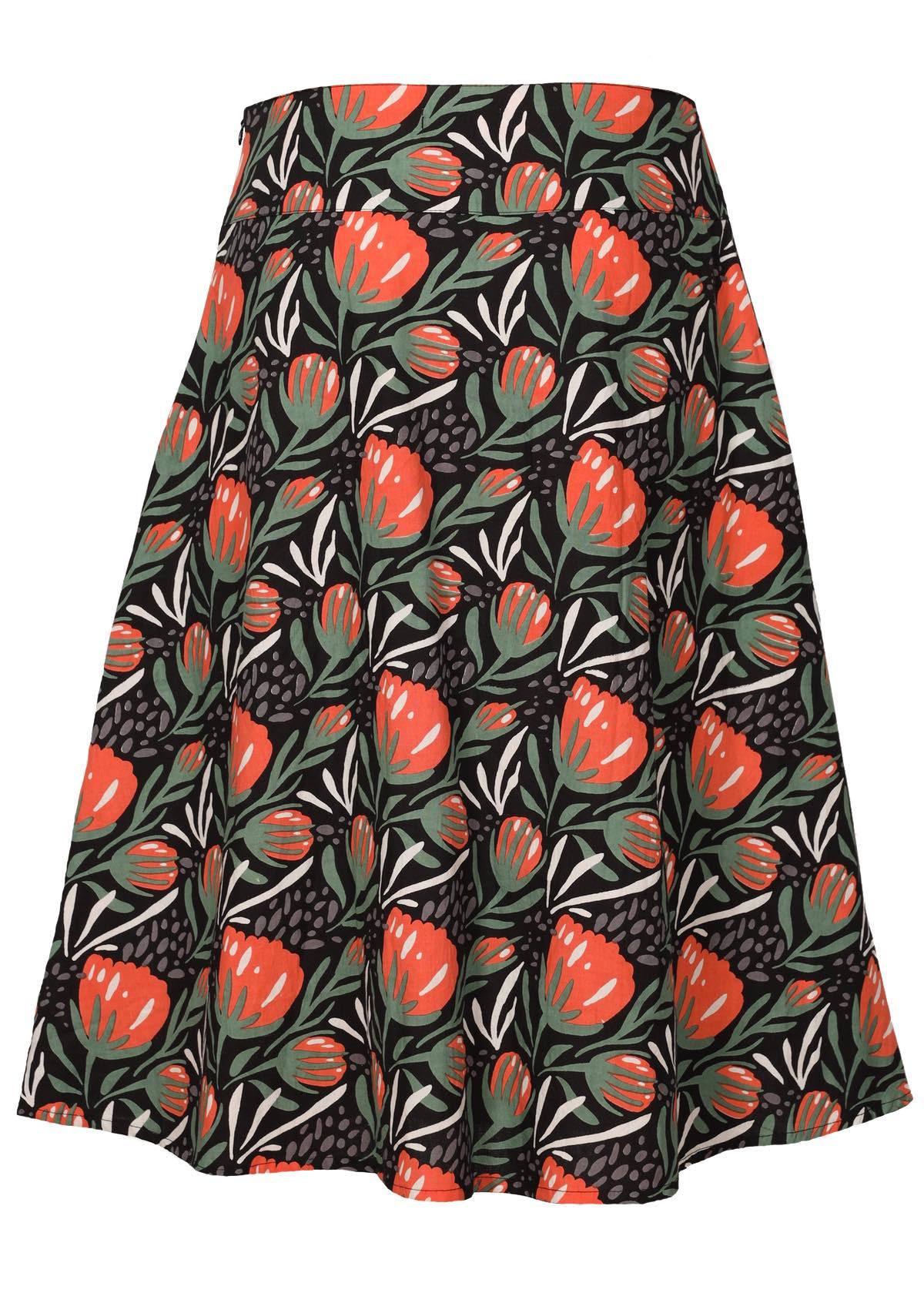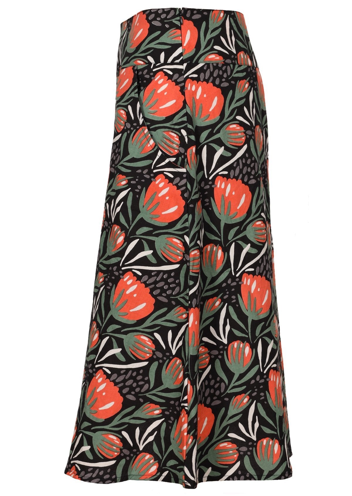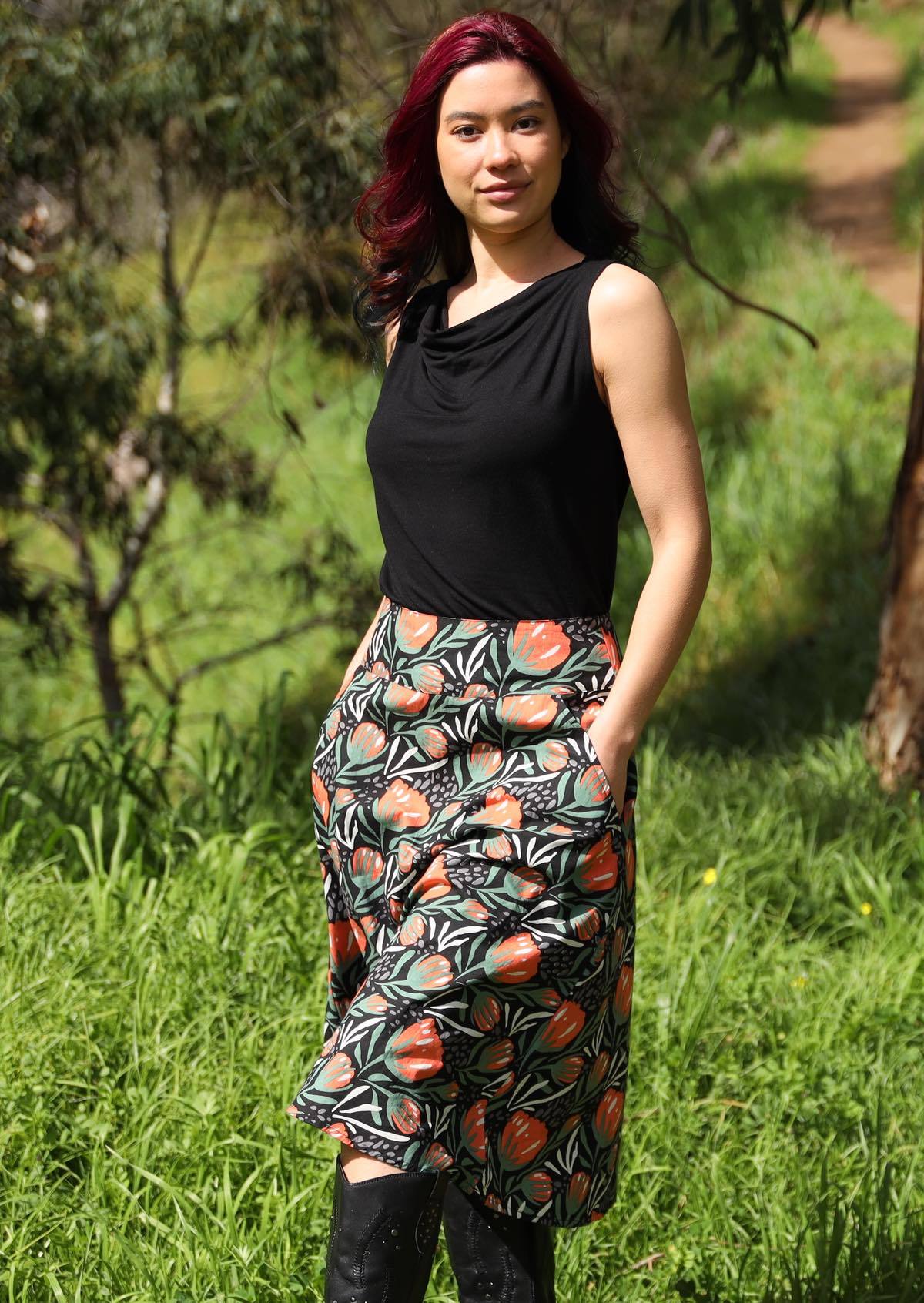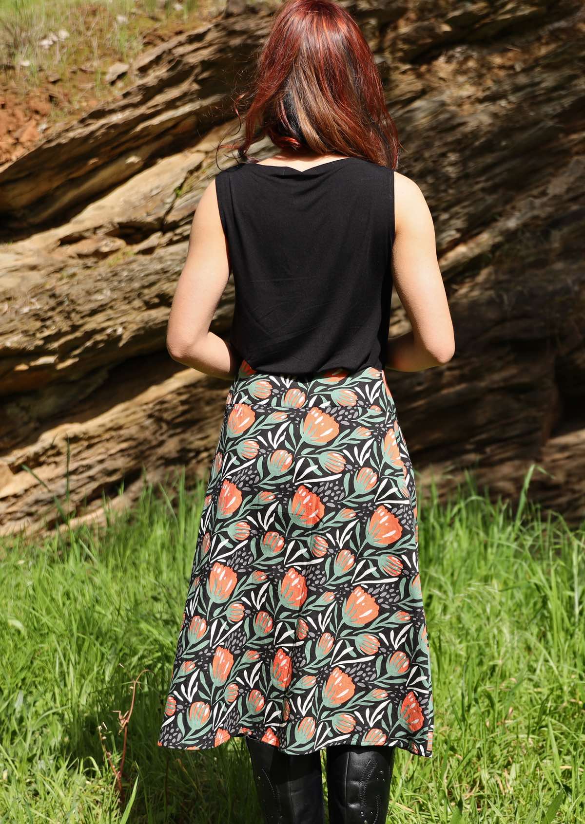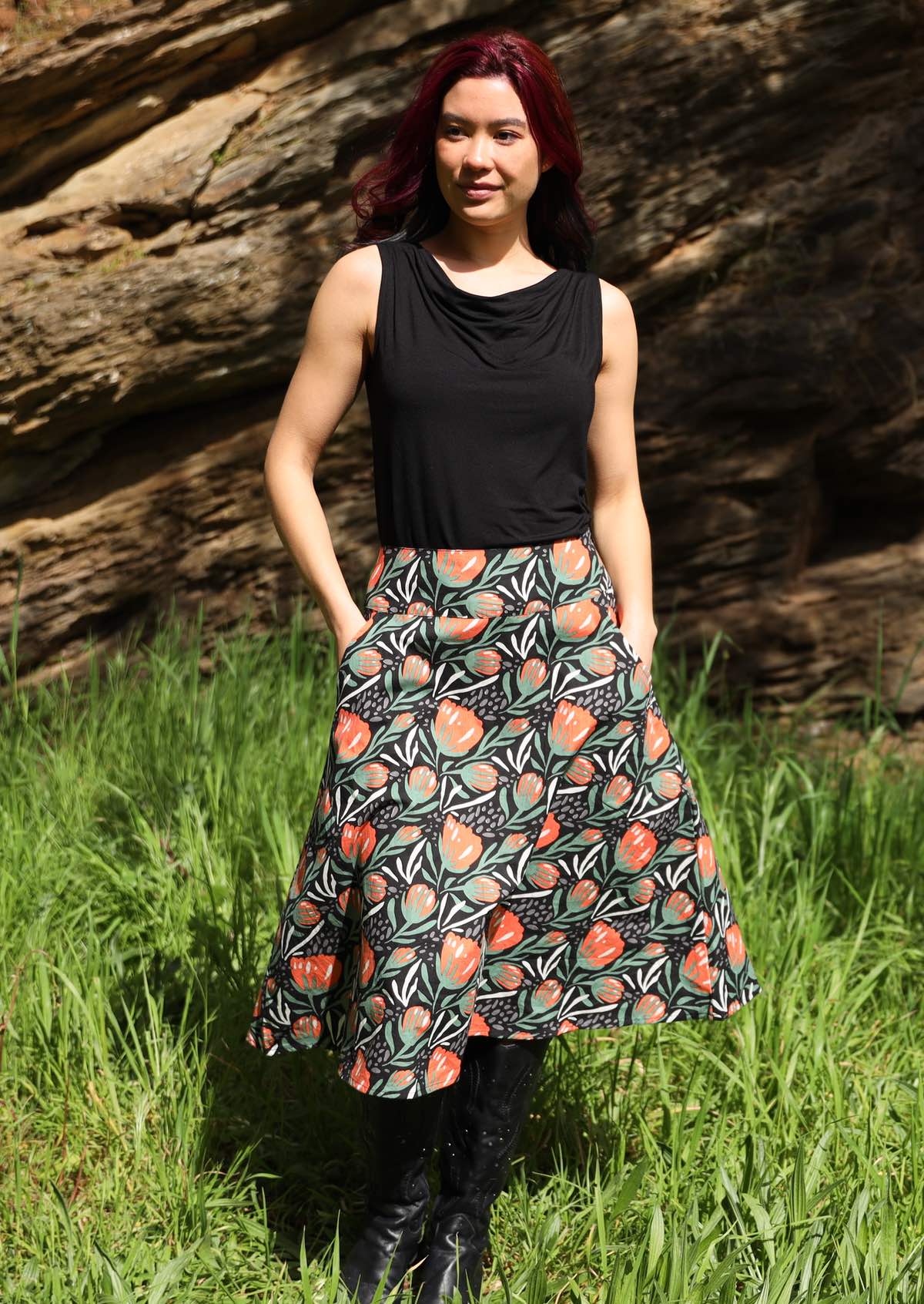 Welcome back the Zarah Skirt in Botany, a stylised Australian native floral print on a black base. This 100% cotton, generous A-line skirt boasts a wide waistband and practical side zip with pockets, making it both stylish and functional. Perfect for any occasion, pair it with your favourite top for a chic and effortless look. This skirt sits over the knee. Can be worn lower to the hips, or up on waist, check measurements to help decide the fit for you.