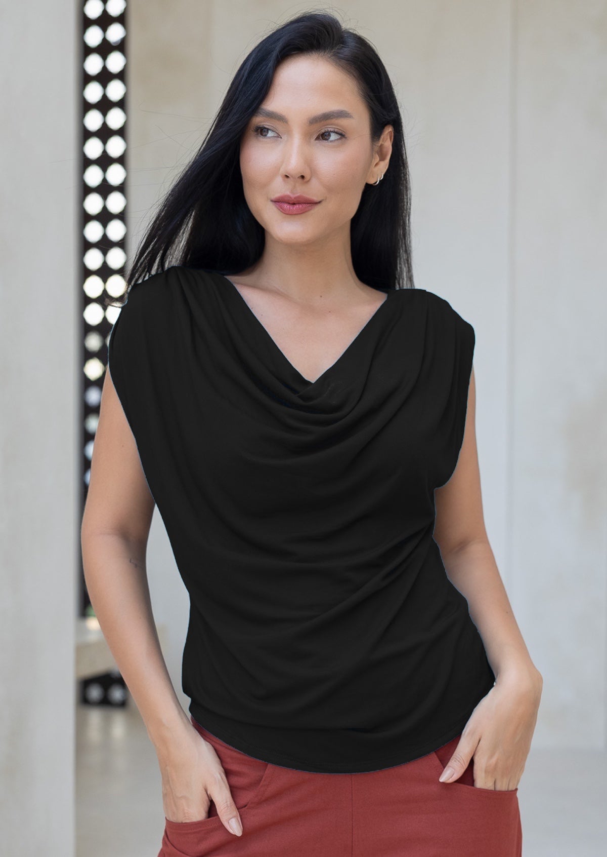 If you like our Cowl Neck Top, then you'll love our Pleated Cowl Neck Top. Designed for both comfort and style, this sleeveless top, in classic black, showcases a flattering cowl neck, with the addition of pleated details at each shoulder seam. The soft, stretch rayon jersey feels wonderful against the skin and drapes beautifully over your figure. Sitting just below the hip bone, it’s perfect with some Karma East printed cotton pants, or skirts - so good you’ll want more than one.