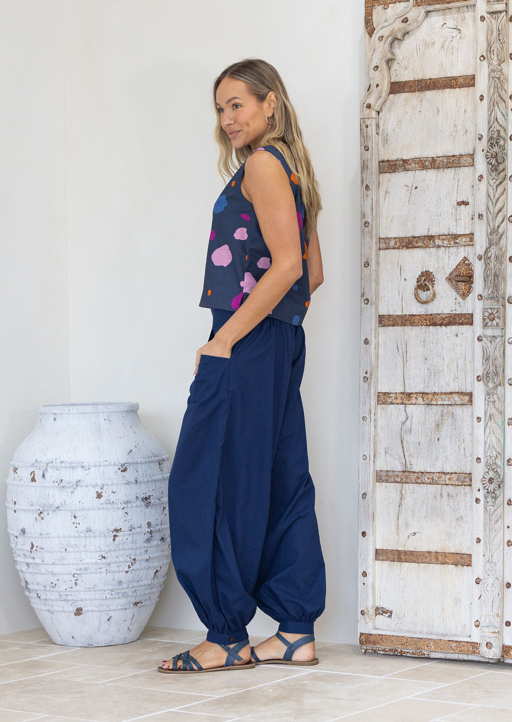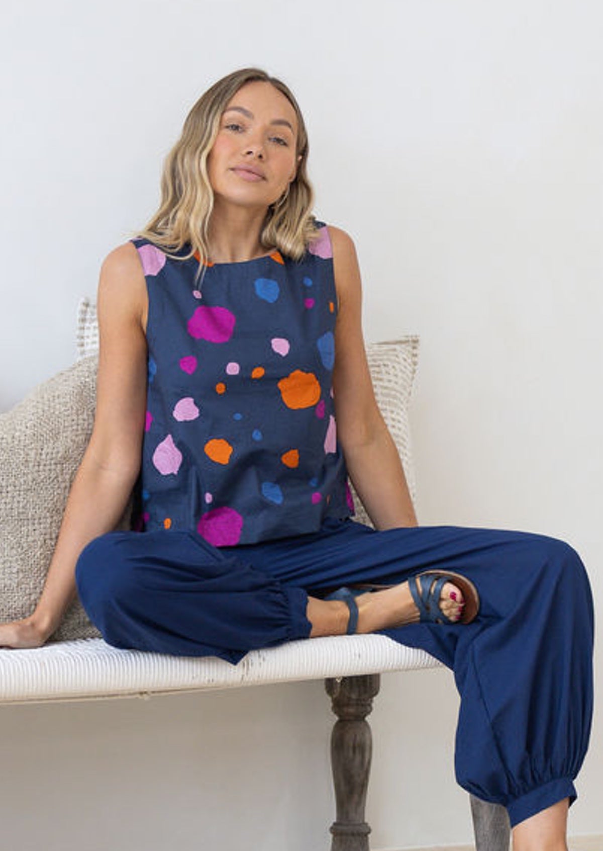Experience the ultimate in comfort with our Boxy Top in the Dapple print, a fun orange, blue, plum and pale pink spotty print on a navy blue base. Made from breathable 100% cotton, the sleeveless design is perfect for those warmer days. The straight edges of this top give it a relaxed fit that sits above the hips, with bust darts to give some shape at the top, and a round neckline with a button at the nape of the neck make for ease when dressing, Make a bold statement by pairing this top with our Greta Pants Dapple for a jumpsuit-like appearance, or with our Acapulco Pants Navy, like our model.