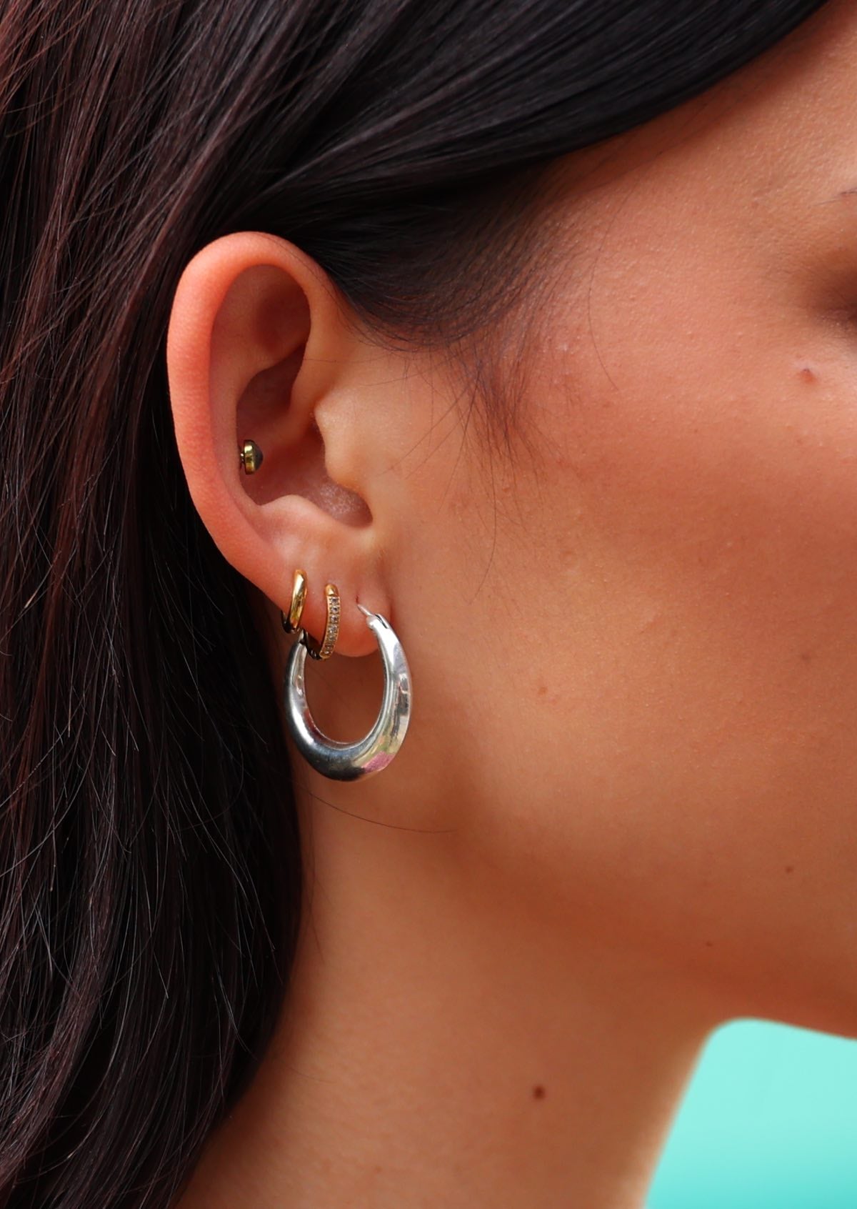 Crafted from quality sterling silver, these Large Silver Hoop Earrings are both elegant and lightweight with a hollow centre. Suitable for everyday wear, or as chunky seconds. Approximately 25mm in diameter, with a maximum 3mm in thickness that tapers slightly, these hoops are secured with a spring closure, where the wire is inserted into the opposite tube of the hoop.