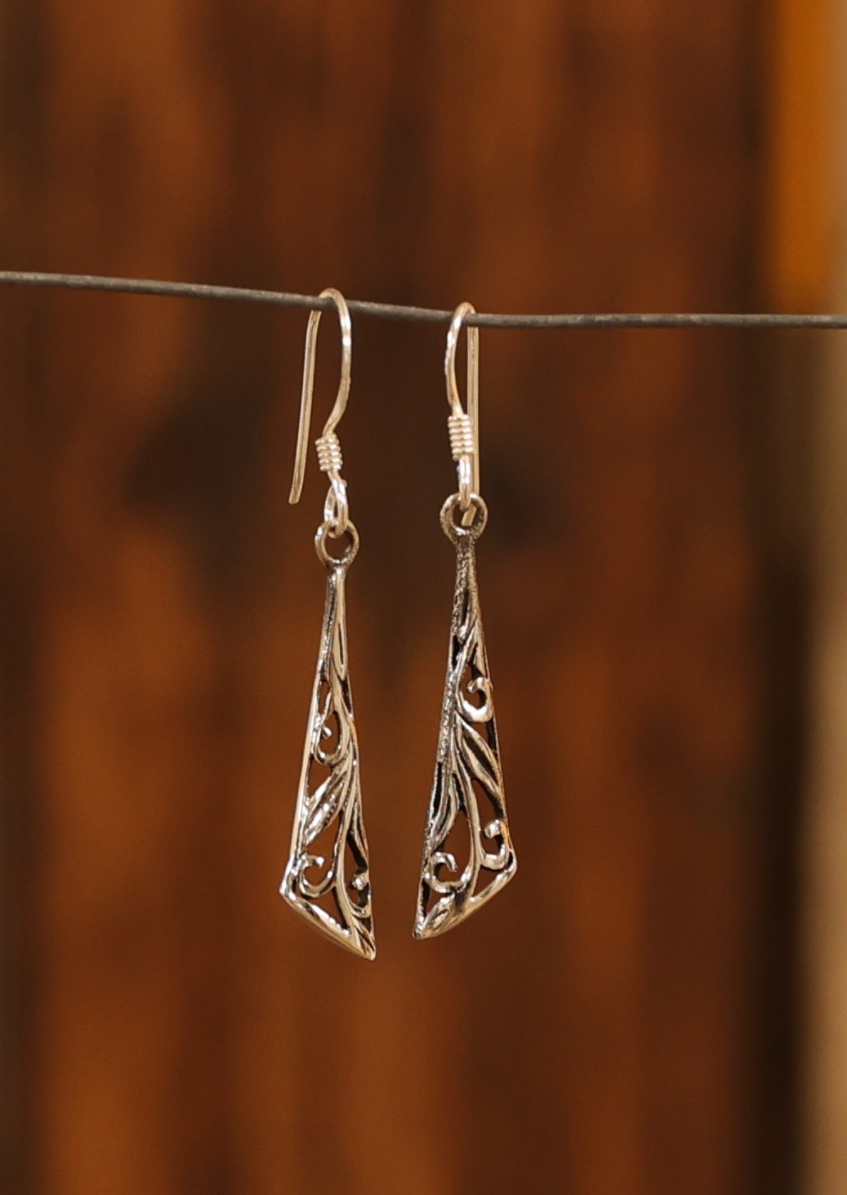 Elevate your style with our Obtuse Triangle Silver Drop Earrings. The elongated triangle drop shape, crafted from sterling silver, features intricate cutout details, forming a filigree design. Suspended from a hook, these earrings will add a touch of elegance and sophistication to any outfit. Measuring 6mm in width at the base, and 40mm long, including the hook.
