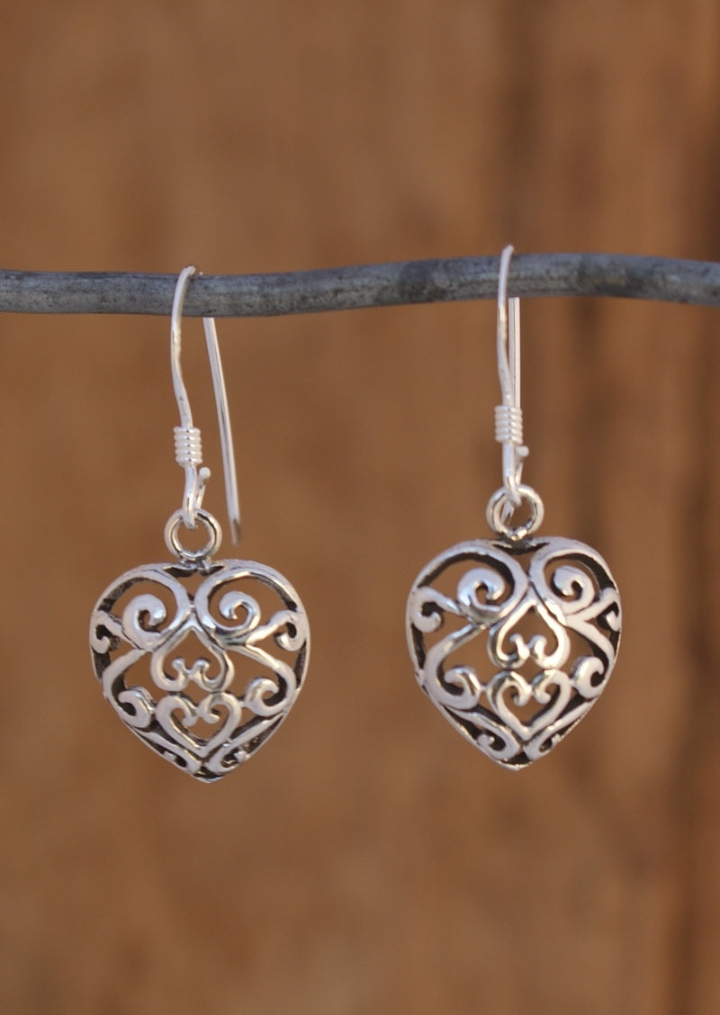 Elevate your style with our Silver Filigree Heart Drop Earrings. The heart drop shape, crafted from sterling silver, features intricate cutout details, forming little hearts. Suspended from a hook, these earrings will add a touch of elegance and sophistication to any outfit. Measuring 10mm in width at the base, and 40mm long, including the hook.