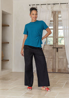 A short-sleeve, crew-neck top made from soft, stretch rayon jersey, designed for everyday comfort, featured in rich teal. The top features a subtle twist knot detail on one side, creating a softly draped effect that adds shape and interest to the otherwise classic silhouette. The hemline is slightly asymmetrical at the front due to the gathered twist, making it a versatile piece for both casual and smart-casual styling.