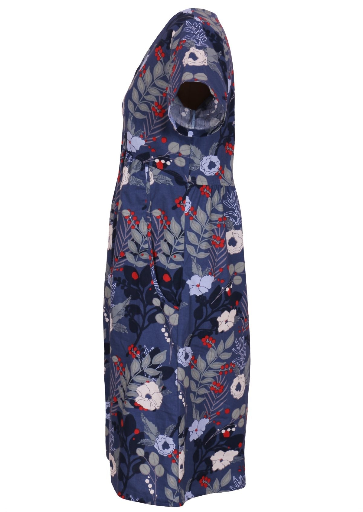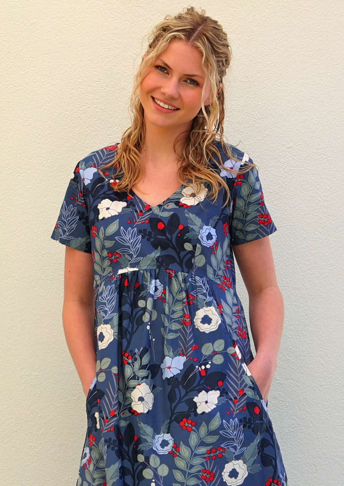 The gorgeous Etta Dress is made from 100% cotton, in the bold Gardenia print of blues and with pops of red on a grey blue base. This versatile and comfortable cotton dress is perfect for any occasion with its V-neck and empire waistline, this dress flatters any figure. Convenient pockets make it practical for everyday wear. With no zip, simply slip it on and go. Wear with flats or heels, add leggings, boots and a corduroy jacket for a stylish look in cooler weather.